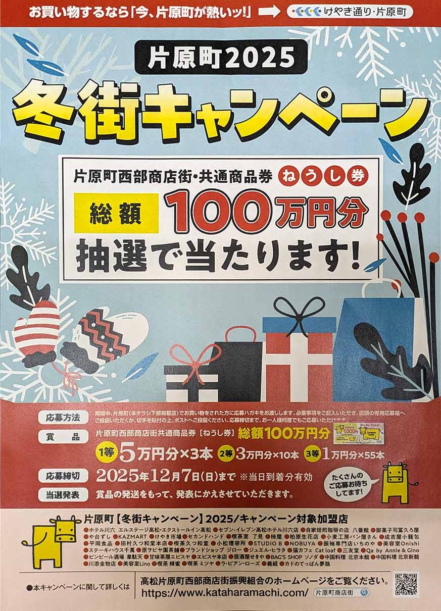 - お買い物するなら「今、片原町が熱いッ!」 片原町西部商店街・共通商品券(ねうし券)総額100万円分 抽選で当たります! たくさんのご応募お待ち...